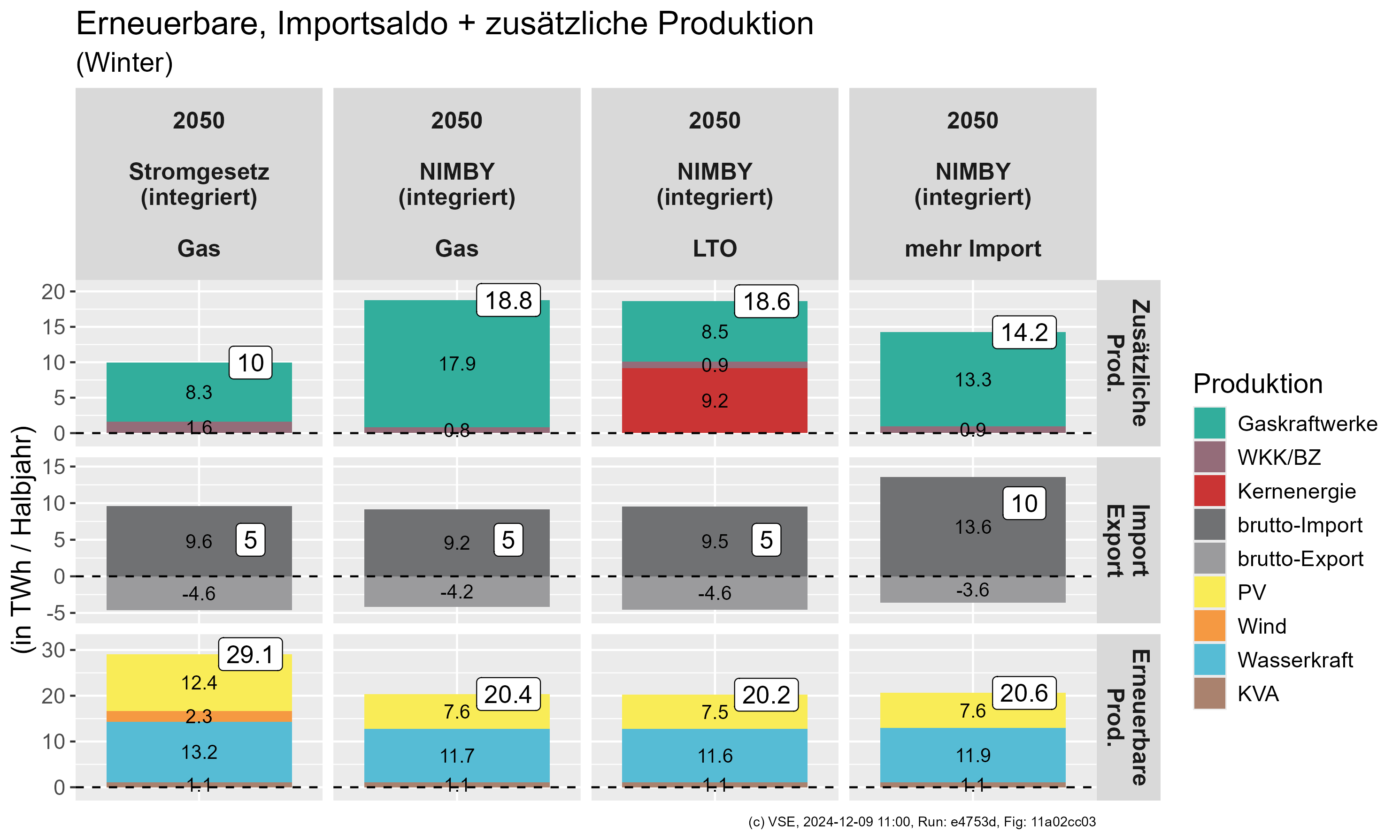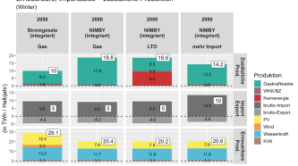 Mit dem Ausbau der Erneuerbaren gemäss Stromgesetz verschafft sich die Schweiz eine bessere Ausgangslage für die Winterversorgung. Doch auch wenn die Ausbauziele im Stromgesetz erreicht werden, braucht es in den Wintermonaten ergänzende Stromproduktion. Die Art dieser Produktion hängt vom gesellschaftlichen und politischen Willen ab. Es wurden verschiedene Varianten für ergänzende Produktion berechnet: mehr Wind, zusätzliche Importe über das Stromgesetz hinaus, Gaskraftwerke (möglichst klimaneutral betrieben) oder Langzeitbetrieb eines bestehenden Kernkraftwerkes (Langzeitbetrieb = 80 J.).