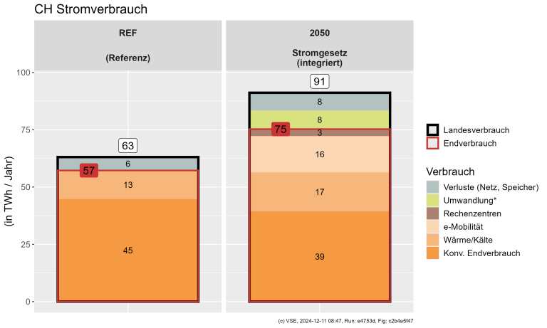 Der Landesstromverbrauch steigt um rund 50% auf ca. 91 TWh bis 2050 gegenüber heute. Die Hauptgründe für den steigenden Stromverbrauch sind die Elektrifizierung von Mobilität und Wärme/Kälte, die Digitalisierung (bspw. Rechenzentren) und die Energieumwandlung (bspw. Elektrolyse, CCS, Grosswärmepumpen für Fernwärme). Der Gesamtenergieverbrauch der Schweiz sinkt jedoch deutlich, weil Strom effizienter ist als fossile Energien. Ohne zukünftige Effizienzmassnahmen wäre der Stromverbrauch im Jahr 2050 um ca. 10 TWh höher.