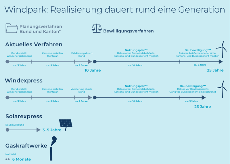 Trotz der willkommenen Unterstützung durch den Windexpress stellt man fest: Die Realisierung eines Windparks dauert immer noch rund eine Generation. Aufgrund der Planungsverfahren von Bund und Kantonen, die etwa zehn Jahre in Anspruch nehmen, und dem zweistufigen Bewilligungsverfahren (Nutzungsplan und Baubewilligung), für das ungefähr 15 Jahre veranschlagt werden müssen, kann ein Windpark nach etwa 25 Jahren realistischerweise realisiert werden. Dank dem Windexpress sollen die betroffenen Projekte in der Endphase des Baubewilligungsverfahrens zwei Jahre «gewinnen». Die Dauer dieser Verfahren ist eindeutig nicht mit der Dringlichkeit der Stromversorgungssicherheit vereinbar. Zur Erinnerung: Die Europäische Union verlangt von ihren Mitgliedsstaaten, dass das Planungs- und Bewilligungsverfahren nicht länger als zwei Jahre dauern darf. Der Bundesrat ist sich der Notwendigkeit bewusst, das Tempo beim Ausbau der erneuerbaren Energien zu steigern, und hat einen Gesetzesentwurf zur Beschleunigung der Verfahren vorgelegt.