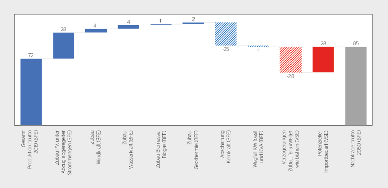 Zukünftige Nachfrage und Produktion: 2050 wird die Stromnachfrage in der Schweiz voraussichtlich rund 85 TWh betragen. Ohne entsprechende Massnahmen wird die heimische Produktion allerdings bloss 73 TWh bereitstellen können. (Quelle: VSE)