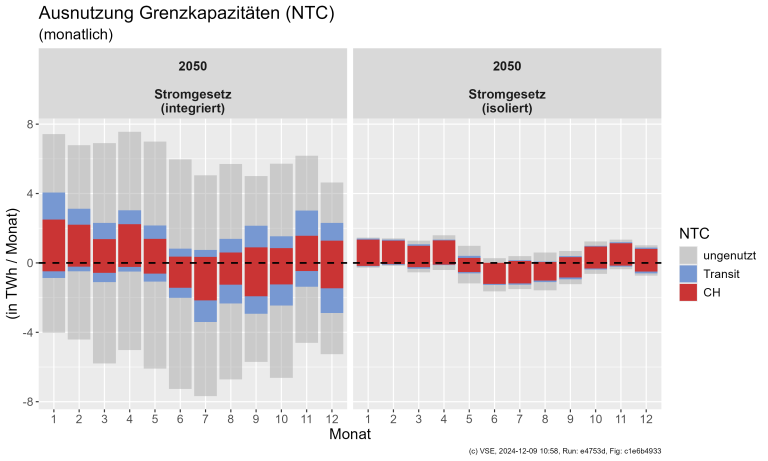 Verfügbare und für Transit und Schweizer (CH) netto-Importe/Exporte genutzte Grenzkapazität (NTC) in den Szenarien «Stromgesetz mit Stromabkommen» (integriert) bzw. «Stromgesetz ohne Stromabkommen» (isoliert).