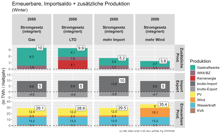 Die Stromversorgung im Winter bleibt auch in Zukunft die grosse Herausforderung. Denn nicht nur muss der steigende Strombedarf gedeckt werden – der Landesstromverbrauch steigt bis 2050 um rund 50% auf ca. 90 TWh –, sondern auch die Abschaltung der Kernkraftwerke kompensiert werden (ab 2040er Jahre). Mit dem Ausbau der Erneuerbaren gemäss Stromgesetz verschafft sich die Schweiz eine bessere Ausgangslage für die Winterversorgung. Doch auch wenn die Ausbauziele im Stromgesetz erreicht werden, braucht es in den Wintermonaten ergänzende Stromproduktion. Die Art dieser Produktion hängt vom gesellschaftlichen und politischen Willen ab. Der VSE hat verschiedene Varianten für ergänzende Produktion berechnet: mehr Wind, zusätzliche Importe über das Stromgesetz hinaus, Gaskraftwerke (möglichst klimaneutral betrieben) oder Langzeitbetrieb eines bestehenden Kernkraftwerkes (Langzeitbetrieb = 80 J.).