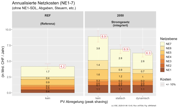 Dieser Kostenanstieg kann mit verschiedenen Massnahmen substanziell gedämpft werden. Allein die Einspeisebegrenzung von 3% der Jahresproduktion von PV-Anlagen führt zu einer Reduktion der Netzkosten. Wird diese statisch umgesetzt, d.h. eine fixe Einspeisebegrenzung der Anlagen bei einem bestimmten Prozentsatz der installierten Leistung, betragen die Netzkosten im Jahr 2050 ca. 7 Mrd./J. Mit einer dynamischen PV-Einspeisebegrenzung, d.h. eine bedarfsgerechte Einspeisebegrenzung der Anlagen, könnte der Kostenanstieg um eine weitere halbe Milliarde gedämpft werden.