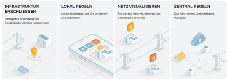 Um auch zukünftig den stabilen und kosteneffizienten Betrieb des Verteilnetzes zu gewährleisten, müssen sich EVU bereits heute mit den Herausforderungen der Elektrifizierung und Dezentralisierung befassen. Ein intelligenter Verteilnetzbetrieb erfordert Massnahmen auf vier Ebenen: Infrastruktur erschliessen, lokal regeln, Netz visualisieren und zentral regeln.