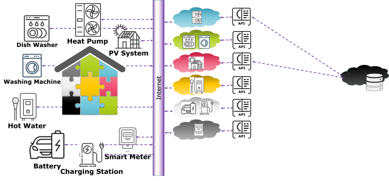 Nun stellt sich die Frage, ob sich mit diesen Daten – auch kombiniert aus unterschiedlichen Quellen – nicht noch weitere Anwendungsfälle erschliessen lassen. Mit den Daten der Wärmepumpe und der PV-Anlage sowie Wetterdaten liesse sich bereits ein einfaches Heim-Energiemanagementsystem (HEMS) realisieren (Abbildung 1, ganz rechts). Anstatt dass nun der Anbieter des HEMS die Daten erneut erfasst, wäre es viel effizienter, wenn er auf die bereits erfassten Daten in den Clouds der verschiedenen Gerätehersteller zugreifen könnte. Es geht somit um die sekundäre Datennutzung, also eine Nutzung von für einen anderen Zweck erfassten Daten [1].