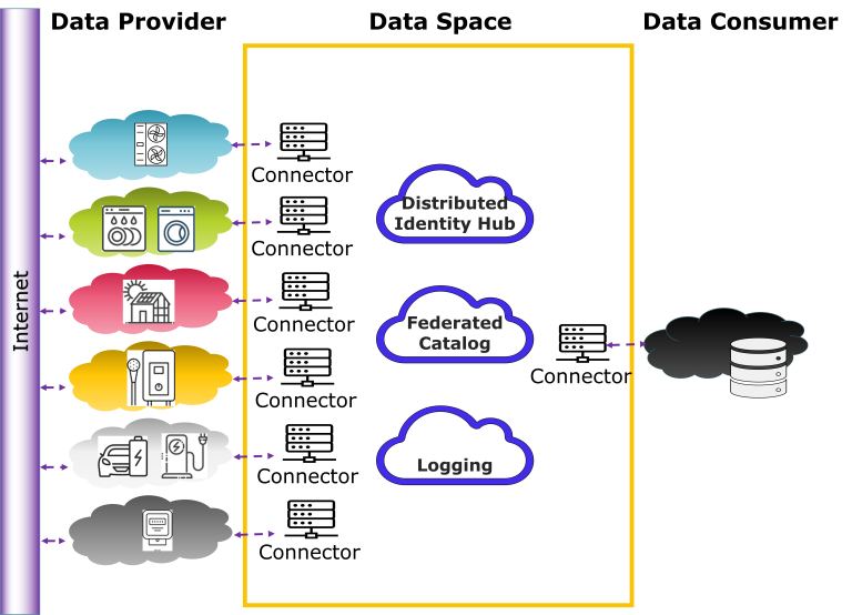 Eine zentrale Komponente der Datenräume ist der Konnektor. Der Konnektor ist mit der Datenquelle verbunden und kann so die Daten im Datenraum zur Verfügung stellen. Die Anbindung an die Datenquelle erfolgt oft über sogenannte Representational State Transfer (REST) APIs. Ein Konnektor garantiert zudem, dass die Daten nur gemäss den Datennutzungsrichtlinien, welche die Dateneigentümerschaft festlegt, ausgetauscht werden. So kann die Verwendung zeitlich, geografisch oder auch auf bestimmte Teilnehmende eingeschränkt werden. Die Konnektoren werden von datenanbietenden (z.B. Hersteller von Wärmepumpen) wie auch datenkonsumierenden (z.B. Dienstanbieter für Energiemanagement) Organisationen betrieben.