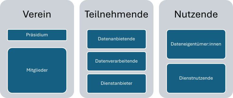 Der Betrieb eines Datenraums erfordert eine Organisation, die z.B. als Verein organisiert sein kann [4]. Sie erstellt die Regeln im Datenraum und setzt sie durch. In einem Datenraum bestehen noch weitere Rollen wie die Datenanbietenden, Datenverarbeitenden, Personen und Organisationen, welche Daten erzeugen und Betreiber von Infrastruktur-Hardware. Nicht alle Rollen müssen in der betreibenden Organisation Mitglied sein. So ergibt sich die in Abbildung 3 gezeigte organisatorische Struktur.