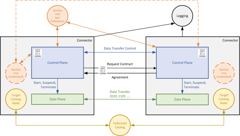 Die technische Umsetzung der Datenräume muss die Bestrebungen auf organisatorischer Ebene unterstützen. Die technischen Komponenten sind ein weiteres Element, um die Vertrauenswürdigkeit in Datenräumen zu gewährleisten. Als Komponenten benötigt ein Datenraum Konnektoren, einen Identity Hub, einen Federated Catalog und ein Logging (Abbildung 4).
