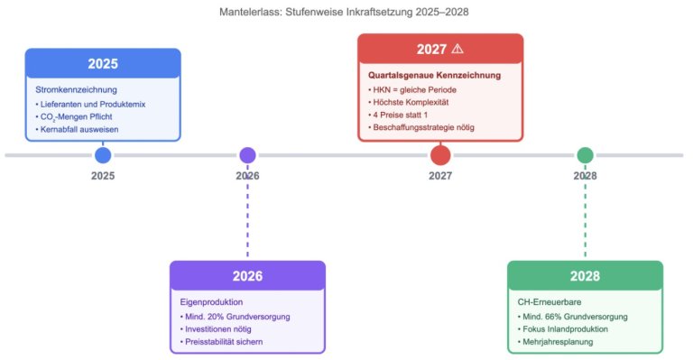 Pflicht zur Eigenproduktion oder erweiterten Eigenproduktion (ab 2026): Ab 2026 müssen EVUs mindestens 20 Prozent ihrer Grundversorgung über eigene oder erweiterte Eigenproduktion decken. Ziel des Gesetzgebers ist eine gewisse Preisstabilität für Kunden zu gewährleisten. Für EVUs bedeutet dies Investitionen in Anlagen oder Beteiligungsmodelle, bei denen sie sowohl Energie als auch HKN übernehmen.