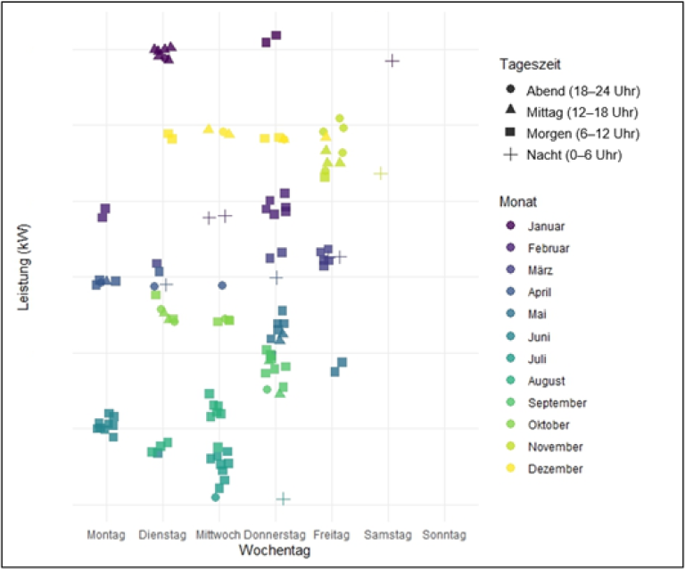 Untersucht wird, zu welchen Tageszeiten, an welchen Wochentagen und in welchen Jahreszeiten diese Spitzen auftreten (Abbildung 3).