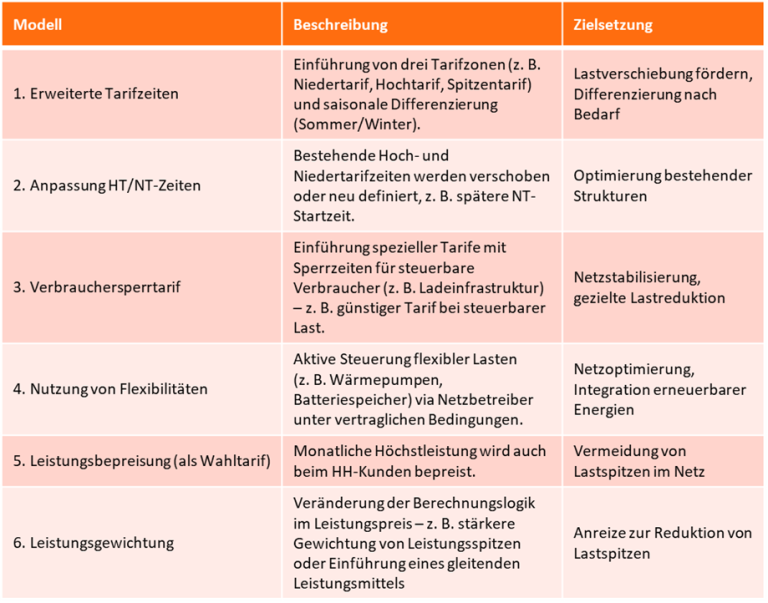 Auf dieser Grundlage können mögliche neue Netznutzungstarifmodelle identifiziert und hinsichtlich ihrer Eignung für unterschiedliche Netzsituationen reflektiert werden, etwa in Bezug auf Lastspitzen, Verbrauchsmuster oder regionale Gegebenheiten.