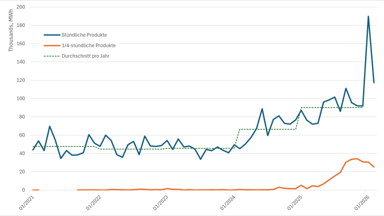 Seit der Einführung des Single Intraday Coupling (SIDC) im Jahr 2018 in Teilen der EU – aber ohne die Schweiz – ist das Volumen des Schweizer Intraday-Markts zunächst deutlich gesunken, während andere EPEX-Spot-Märkte im selben Zeitraum kontinuierlich gewachsen sind. Seit 2024 verbessert sich die Liquidität jedoch kontinuierlich: Das gehandelte Volumen im Schweizer Intraday-Markt nahm 2025 gegenüber 2024 um fast 40% auf 1.14 TWh zu. Im Januar 2026 wurde mit 198.7 GWh sogar ein Höchstwert seit 2018 erreicht, wobei sich dies jedoch auf sehr grosse Handelsaktivitäten an einzelnen Tagen zurückführen lässt und der Monat Februar 2026 wieder stärker der Entwicklung im Vorjahr entspricht.