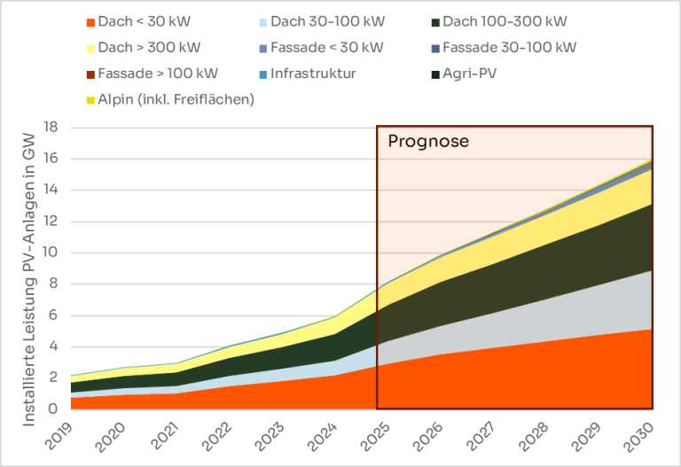[3] Per Ende 2023: 6.4 GW installierte Leistung; per Ende 2024: 8.2 GW installierte Leistung; Quelle: BFE: Statistik Sonnenenergie 2024 vom 10.07.2025