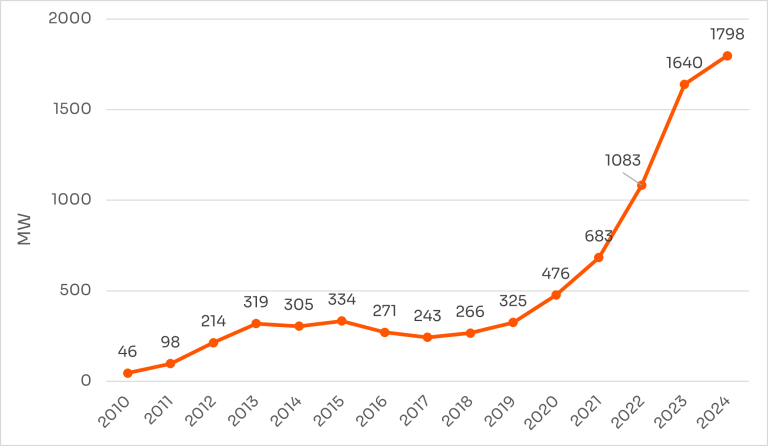 Gemäss Swissolar erfolgt dabei der PV-Zubau in den kommenden Jahren nahezu ausschliesslich durch Dachanlagen. In Abbildung 1 wird die Entwicklung der installierten Leistung in GW nach Anlagekategorie deutlich: Während seit 2019 sämtliche Segmente ein Wachstum verzeichnen, wird die Entwicklung am stärksten durch Dachanlagen getragen – sowohl von kleinen Anlagen unter 30 kW als auch von Anlagengrössen zwischen 30 und 300 kW. Fassadenanlagen, Infrastrukturprojekte und Freiflächenanlagen leisteten dagegen bislang nur einen marginalen Beitrag. Diese Entwicklung wird sich auch in Zukunft fortsetzen: Swissolar rechnet damit, dass sich der Ausbau vorwiegend bei den Dachanlagen nochmals deutlich beschleunigen dürfte, nicht zuletzt aufgrund der hierfür im Mantelerlass verankerten Anreize.