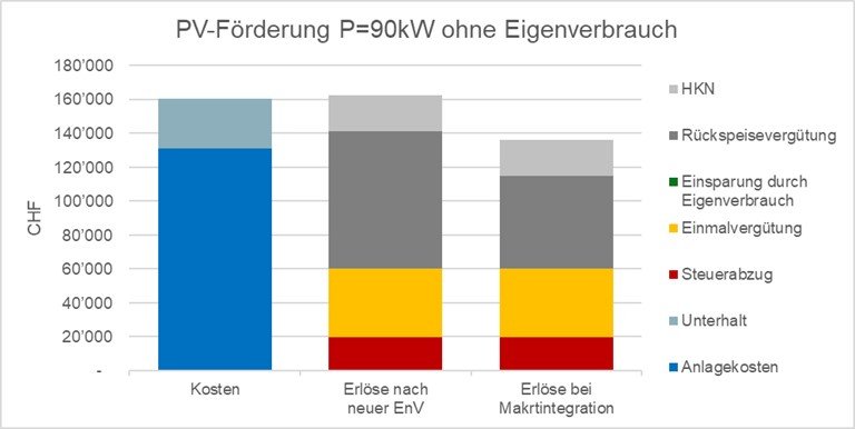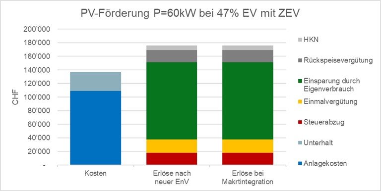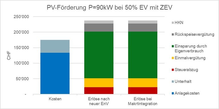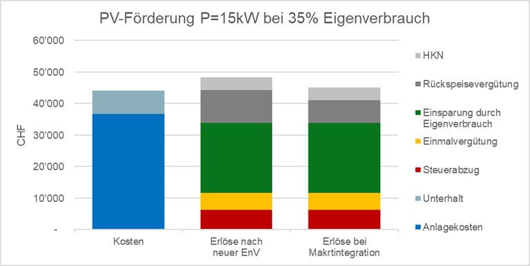 Die Rückspeisevergütung würde bei Einführung von Marktpreisen unter Druck kommen, der Eigenverbrauch wurde aber bereits mit den neuen Instrumenten der virtuellen Zusammenschlüsse zum Eigenverbrauch (vZEV) und der lokalen Elektrizitätsgemeinschaften (LEG) gestärkt. Ausserdem kommen mögliche Erlöse aus Flexibilität neu hinzu. Auf der Kostenseite stehen Aufwendungen für lokale Speicher und EMS, um auf dynamische Signale adäquat reagieren zu können.