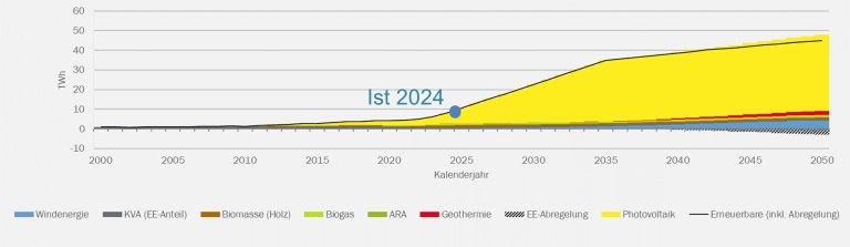 Das am 9. Juni 2024 vom Volk angenommene Stromgesetz beinhaltet ehrgeizige Ziele zum Ausbau der erneuerbaren Energien in der Schweiz. So sollen bis 2035 zusätzlich 35 TWh pro Jahr aus erneuerbaren Energien ohne Wasserkraft produziert werden, bis 2050 sind es 45 TWh pro Jahr. Gleichzeitig soll der Import im Winterhalbjahr 5 TWh nicht überschreiten. Im Gesetz wird keine weitere Aufteilung auf Produktionsarten ausgeführt, angesichts der begrenzten Möglichkeiten bei der Biomasse, Akzeptanzproblemen beim Wind und mangelnder technologischer Reife anderer Produktionsarten dürfte der weitaus grösste Teil aber auf die Photovoltaik (PV) entfallen, die als einzige zur Verfügung stehende Technologie in grösserem Umfang skalierbar ist.