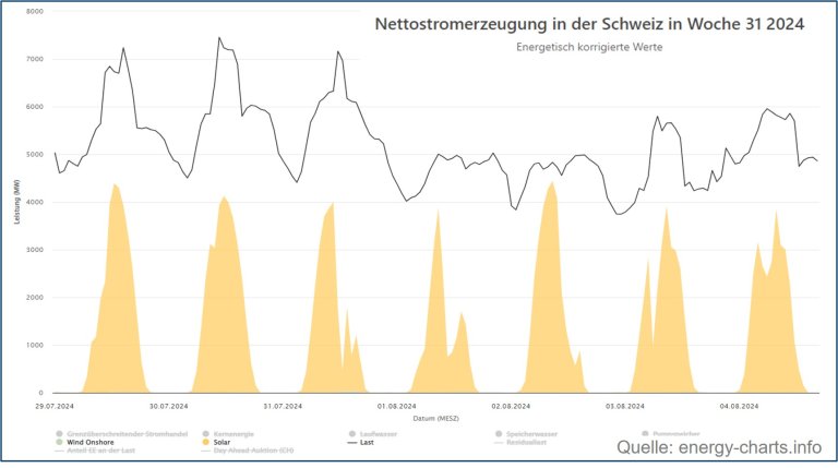 Obwohl der bisherige Zubau auf dem Zielpfad liegt, kann der eingeschlagene Weg nicht einfach weitergegangen werden. In Zeiten niedriger Last aber hoher Sonneneinstrahlung deckt die derzeitige PV-Produktion bereits heute in einzelnen Stunden fast die gesamte Last in der Schweiz (Bild 2). In diesen Situationen ergeben sich regelmässig negative Marktpreise. Eine einfache Skalierung des bisherigen Zubaus auf die Ziele aus dem Stromgesetz würde zu einer drastischen Verschärfung dieser Situationen führen. Die entstehenden Einspeisespitzen werden weder durch eine Flexibilisierung der Lasten noch durch eine begrenzte Abregelung vollständig kompensiert werden können. Auch die Leistung der Pumpspeicher in der Schweiz wird bei Weitem nicht ausreichen, um die immensen Überschüsse an sonnigen Sommernachmittagen aufzunehmen. Da unsere Nachbarländer ähnliche Zubauziele wie wir verfolgen, stellt auch der Export keine Option dar.