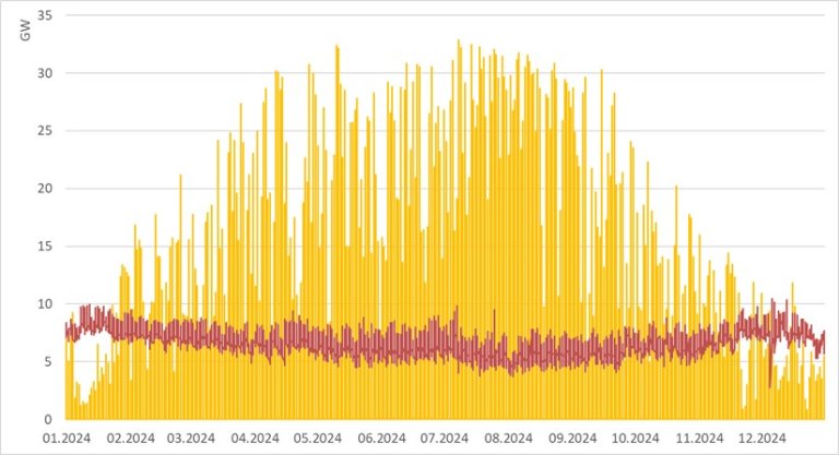 Das Problem beschränkt sich dabei nicht auf die Energiebilanz, auch die Netze können eine Skalierung des bisherigen PV-Zubaus nicht bewältigen. Bild 3 zeigt die heutige PV-Produktion, hochgerechnet auf die Ziele des Stromgesetzes im Vergleich zur heutigen Last. Die bisherige maximale Netzlast beträgt ca. 10 GW – für diese Leistung sind die Verteilnetze heute ausgelegt. Es ist leicht zu erkennen, dass auch die Verteilnetze die Skalierung des bisherigen Zubaus auf die Ziele des Stromgesetzes nicht verkraften. Wegen der ungleichen lokalen Verteilung von Last und Einspeisung dürfte die Situation in vielen Verteilnetzen sogar noch wesentlich drastischer ausfallen, als in dieser groben, summarischen Analyse dargestellt.