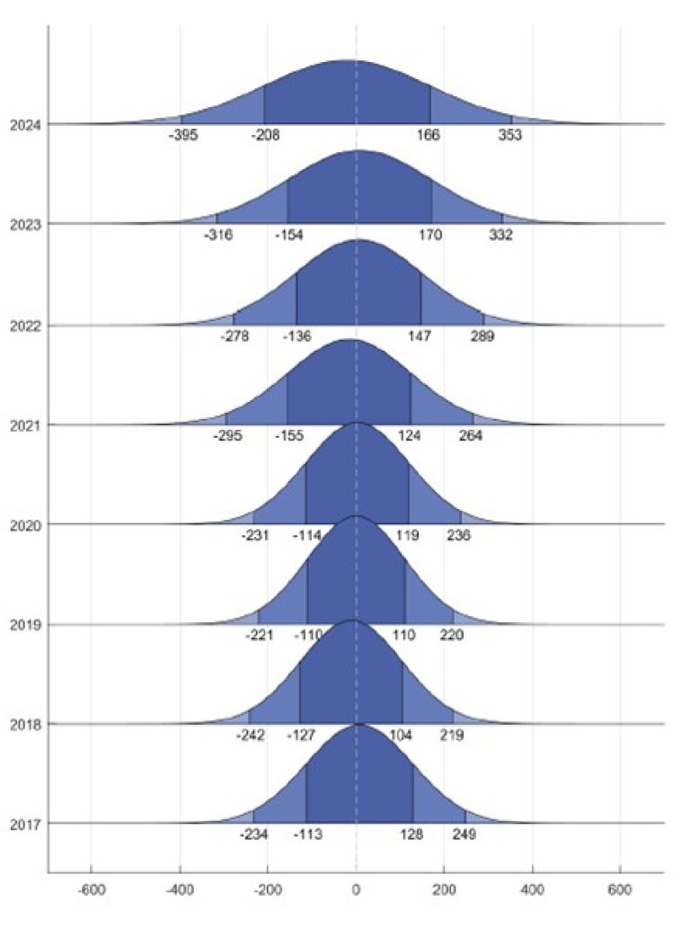 Auch bei der Systemstabilität verursacht der PV-Ausbau zunehmend Schwierigkeiten. Diesen kann zwar mit verbesserten Prognosemodellen begegnet werden, letztlich werden dadurch aber nur die Auswirkungen gedämpft. Der zugrundeliegende Treiber – die Zunahme der volatilen Produktion – bleibt bestehen. Bild 4 zeigt, dass insbesondere die grossen Systemunausgeglichenheiten in der Regelzone Schweiz kontinuierlich zunehmen. Das bisher prominenteste Beispiel war der 22. April 2024, an dem die Unausgeglichenheit bis zu 1400 MW betragen hat.