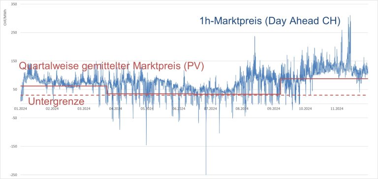 Bisher wird die Einspeisung der allermeisten PV-Anlagen pauschal pro eingespeister kWh vergütet. Basierend auf dem neuen Stromgesetz gelten ab 2026 für diese Anlagen quartalsweise gemittelte Marktpreise mit einer Untergrenze. Bei beiden Modellen werden die Marktpreisschwankungen – insbesondere negative Preise – nicht an die Produzenten weitergegeben. Bild 5 zeigt den Marktpreis 2024 und das neue Vergütungsmodell an einem Beispiel. Für die Produzenten besteht kein Anreiz, ihr Einspeiseverhalten an den Marktpreisen auszurichten – sogar zu Zeiten negativer Preise erfolgt eine Vergütung.