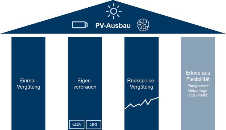 Die vorgeschlagenen Massnahmen werden einerseits die Erlöse, andererseits auch die Kosten von PV-Anlagen beeinflussen. Um die Zubauziele weiter zu erreichen, muss das Fördermodell für PV neu austariert werden. Momentan basiert die PV-Finanzierung für Anlagen bis 150kW auf den drei Säulen Einmalvergütung, Eigenverbrauch und Rückspeisevergütung.