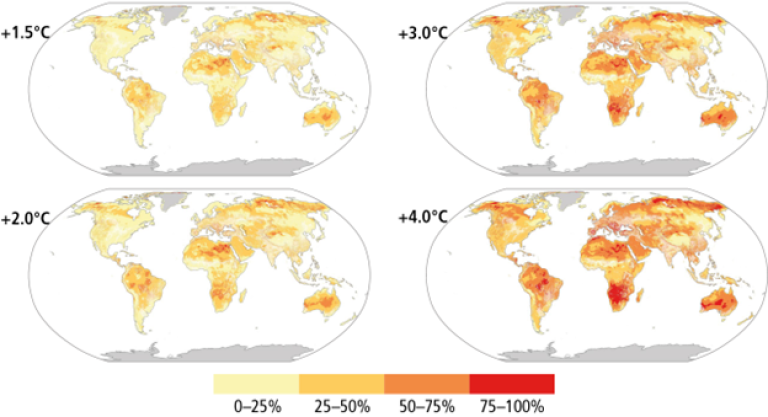 Voraussichtlicher Verlust der Biodiversität bei einer globalen Erwärmung von 1.5, 2, 3 und 4 Grad Celsius [2]