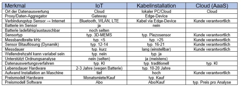 In Tabelle 1 werden ausgewählte Merkmale der PM-Lösungen aus Abbildung 1 verglichen. Es sind jeweils nur die typischen Merkmale von schwingungsbasierten PM-Lösungen und nicht alle technischen Features aufgelistet.