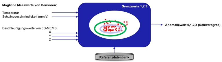 Unter KI verstehen wir hier ein generelles Lernmodell, welches zuerst trainiert werden muss (z. B. auf Daten der überwachten Maschine) und dann im Inferenz-Modus (Dauerbetrieb) Daten prozessiert. Batteriebetriebene Sensoren können offensichtlich keine Modelle mit Milliarden von Parametern beinhalten. Der Mangel an annotierten Trainingsdaten – z. B. für jeden möglichen Lagerschaden, für jeden Wälzlagertyp, für jede erdenkliche Maschine und für alle Betriebszustände – ist ein weiterer Grund, warum sich Anomaliedetektoren bzw. 1-Klassen-Modelle durchgesetzt haben (1-Klassen-Modelle unterscheiden beispielsweise zwischen gut oder schlecht, im Kontext von Maschinen wäre dies der Zustand zum Zeitpunkt des Trainierens (gut) und einer später auftretenden Anomalie (schlecht), deren Daten sich massiv von den guten unterscheiden). Ein Anomaliedetektor könnte zudem auch einfach umgesetzt werden: mit Schwellwerten bei ±3σ der Trainingsdaten erhält man bei gleichbleibender Statistik einen Alarm mit einer Wahrscheinlichkeit von 0.3%. Dies kann zu hohen Falschalarmraten führen.