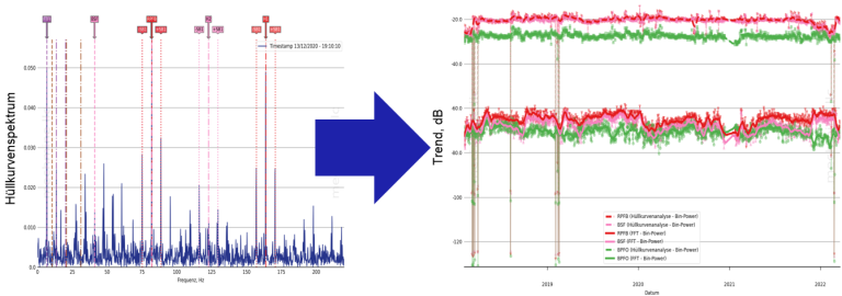 Damit sich die Anlagenbetreiber nicht mit vielen komplizierten Frequenzanalysen herumschlagen müssen, kann man dank Dauerüberwachung davon einfache Trendkurven ableiten. Abbildung 3 illustriert ein Verfahren, welches im Front-end auf dem Kinematikwissen basiert (links) und im Back-end die Trendkurven (rechts) mit einem Anomaliedetektor (KI) überwacht. Jede farbige Linie in der Grafik rechts stellt einen Schädigungstyp dar, bei Wälzlager bis zu fünf oder pro Zahnrad zwei. Eine ansteigende Trendkurve deutet auf eine Verschlechterung des entsprechenden Schadensmusters hin. Die Person, welche die Maschine führt, kann dann basierend auf Fakten – z. B. bei ansteigender Lager-Aussenringüberrollfrequenz – eine passende Massnahme ergreifen. Je nach Schädigungstyp lässt sich eine Charge abarbeiten, statt die Anlage wegen Unkenntnis der Ursache sofort ausser Betrieb zu nehmen, um einem Totalschaden vorzubeugen. Dies ist ein grosser Mehrwert. Das frühzeitige Erkennen eines sich entwickelnden Problems hilft ausserdem der Planung von Revisionen und der gezielten Bestellung und Lagerung von Ersatzteilen.