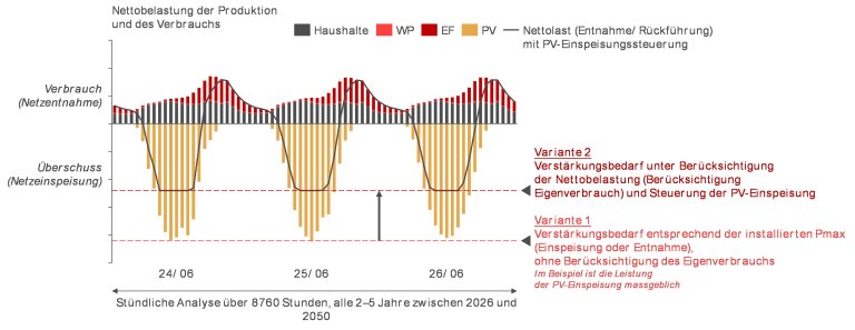 - Modul 4: Für jede Netzebene haben wir die Spannungsanstiege und -abfälle, die Stromstärken und die jährlichen Spitzenleistungen berechnet. Anschliessend haben wir diese Werte mit den zulässigen Werten der modellierten Netzkomponenten verglichen und dabei Sicherheitsmargen berücksichtigt. Diese Analyse wurde in verschiedenen Varianten durchgeführt, um den Verstärkungsbedarf zu ermitteln. Eine erste Variante berücksichtigte beispielsweise die maximal installierte Leistung (ohne Eigenverbrauch), um zu entscheiden, ob eine Netzverstärkung erforderlich ist oder nicht. Eine andere Variante berücksichtigte die Nettolast der Einspeisung und Entnahme, wobei die PV-Einspeisung begrenzt wurde (z. B. gemäss den Bestimmungen von Art. 19c Abs. 4 StromVV). Dies ist in Abbildung 3 dargestellt.