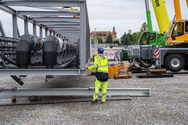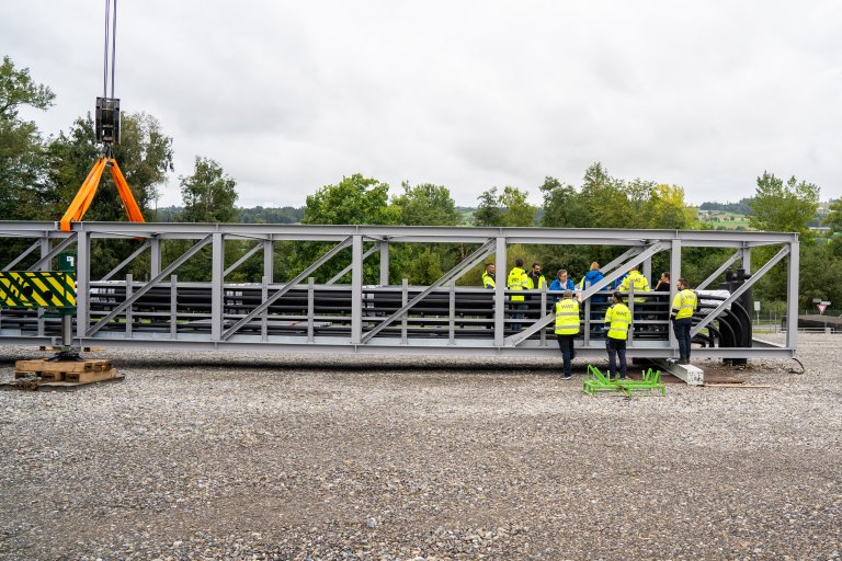 - Die Brücke wird in drei Teilen produziert und in Hochdorf testweise vormontiert. Anschliessend wird sie aufgeteilt, transportiert und vor Ort effizient zusammengesetzt.
