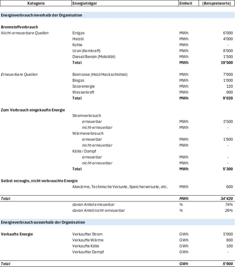 - Gesamtenergieverbrauch inklusive verkaufter Energie, differenziert nach erneuerbaren und nicht-erneuerbaren Quellen sowie nach Energieträger.
