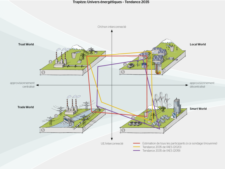 Ce à quoi s’attendent les participants au sondage par rapport aux quatre univers énergétiques fournit une vue d’ensemble sur l’appréciation de l’avenir énergétique par la branche. Ces attentes sont comparées à celles qui résultent des évolutions actuelles au niveau régulatoire, politique et économico-énergétique («actualisation 2020 de la Tendance»). Le quadrilatère l’illustre: il représente la moyenne des attentes des participants au sondage en 2020, ainsi que les mises à jour de la Tendance de l’AES des années 2019 et 2020 sur l’avenir énergétique en 2035.