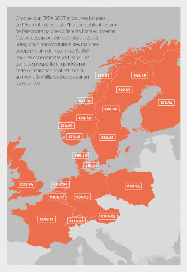 Les bourses de l’électricité des 27 pays de l’UE qui participent au couplage unique journalier (single day-ahead coupling) – ce qui n’est pas le cas actuellement pour la Suisse – calculent toutes simultanément – par un algorithme commun – les prix de l’électricité pour l’Europe en se basant sur l’offre et la demande. Cet algorithme calcule les courbes d’offre et de demande pour chaque pays sur la base des carnets d’ordres et détermine le prix du marché à leur point d’intersection. Dans ce calcul, l’algorithme tient compte de toutes les capacités transfrontalières disponibles entre les pays, veillant ainsi à une utilisation optimale de ces interconnexions. L’électricité circule d’une zone où le prix est plus bas vers une zone où le prix est plus élevé tant que des capacités transfrontalières sont disponibles. Ce mécanisme crée un gain de prospérité annuel de 34 milliards d’euros pour les Européens.