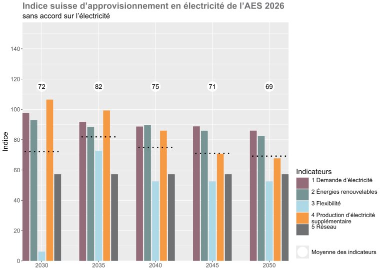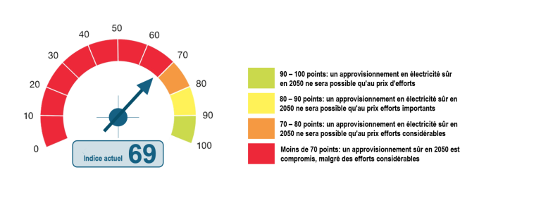 L’indice suisse d’approvisionnement en électricité de l’AES 2026 chute à 69 points d’ici 2050; l’objectif de 100 points est largement manqué.