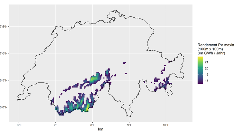 On connaît déjà le potentiel des installations photovoltaïques alpines. Dans le cadre de l’installation du barrage de Muttsee, l’EPFL estime que la production hivernale prévue en altitude est supérieure de 68% à celle du Plateau. Pour la ZHAW, les installations photovoltaïques alpines présentent un potentiel de production d’électricité compris entre 5 et 10 TWh. Les deux auteurs mentionnent en outre que leur degré d’efficacité est environ 11% supérieur à celui d’installations comparables sur le Plateau, en raison de températures plus basses. Pour l’étude de l’AES, on a utilisé le modèle SUNWELL afin de déterminer les profils d’ensoleillement alpins. La figure suivante montre les sites potentiels évalués pour l’implantation d’installations photovoltaïques alpines en Suisse. On constate que c’est le Valais et une partie des Grisons qui présentent le potentiel le plus élevé. Les répercussions sur le réseau électrique n’ont pas été prises en compte dans le cadre de cette estimation du potentiel et feront l’objet d’une analyse détaillée dans le cadre d’une étude sur le réseau menée par l’AES (résultats à l’été 2023).