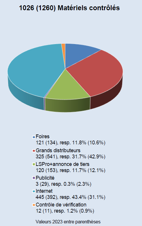 En 2024, 1’026 produits ont été contrôlés au total. Les contrôles ont eu lieu en ligne ainsi que sur place, dans les points de vente et les marchés spécialisés. En outre, des vérifications ont été effectuées directement auprès des fabricants, lors de salons professionnels et à la suite d’annonces de la part de tiers.