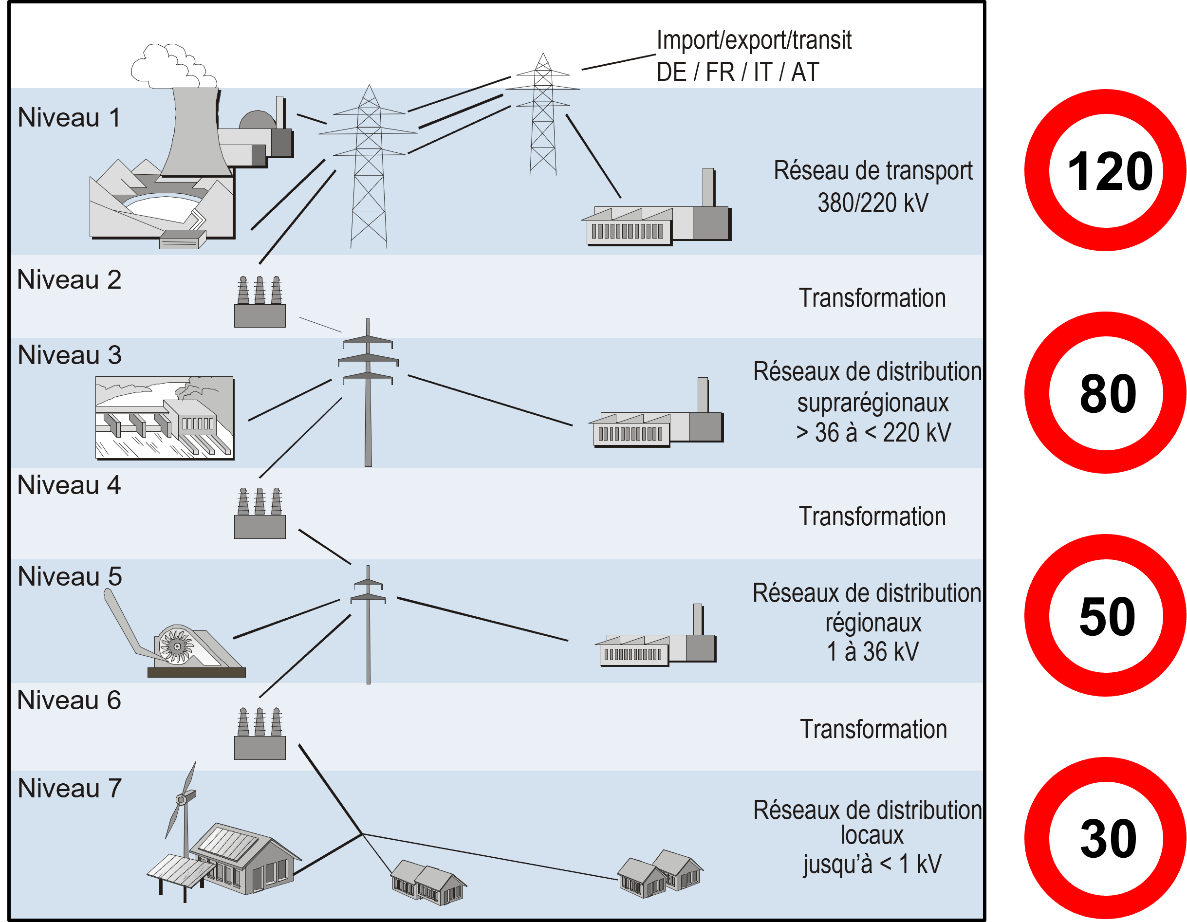 Le niveau de réseau 1, le plus haut, s’appelle le réseau de transport. Le transport depuis les grandes centrales vers les zones de concentration urbaine et le négoce avec les pays voisins s’effectuent à ce niveau. Hormis les CFF, aucun consommateur final n’est raccordé à ce niveau de réseau, mais de grandes centrales telles que la centrale nucléaire de Leibstadt et la centrale hydraulique de la Grande Dixence le sont.