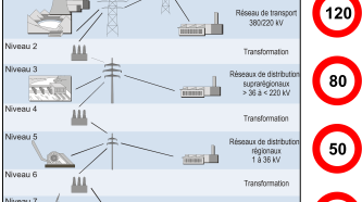 Aux niveaux de réseau pairs 2, 4 et 6, l’énergie est transformée d’un niveau de tension à un autre. Le processus s’effectue au niveau des transformateurs qui se trouvent dans des sous-stations aux niveaux de réseau 2 et 4 et dans des stations transformatrices au niveau de réseau 6.
