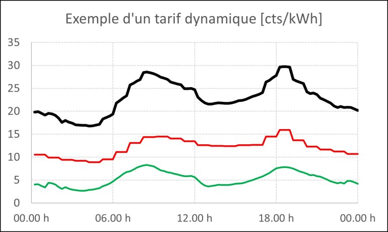 Mais l’électricité ne doit pas seulement être produite et consommée dans la quantité correcte, elle doit aussi être transportée via le réseau électrique de l’installation de production au consommateur. Il faut dès lors déterminer quelles seront les bonnes incitations à donner dans le futur système énergétique du point de vue des réseaux électriques. La variabilité temporelle des flux d’électricité, en croissance avec le tournant énergétique, constitue également un grand défi pour les réseaux électriques. Pour cette raison, il paraît logique d’aller également vers des rémunérations pour l’utilisation du réseau qui soient variables dans le temps. Les rémunérations pour l’utilisation du réseau devraient être élevées pendant les périodes de forte utilisation du réseau et faibles pendant les périodes de faible utilisation du réseau. En Allemagne, les gestionnaires de réseau seront tenus de proposer des tarifs d’utilisation du réseau variables dans le temps à partir de 2025; les clients allemands pourront ainsi choisir un tarif d’électricité composé d’un prix de l’énergie variable et d’une rémunération pour l’’utilisation du réseau variable, mais la variabilité des deux composantes du tarif sera déterminée selon différents critères. Un tarif double avec des prix hauts et bas selon des horaires fixes est un tarif variable dans le temps, mais, pour donner de bonnes incitations, il est nécessaire que les prix et horaires puissent varier plus librement. Un tel tarif dynamique avec un prix qui varie proportionnellement au marché spot et un prix réseau qui varie proportionnellement à la charge du réseau de Groupe E est illustré dans le graphique ci-dessous.