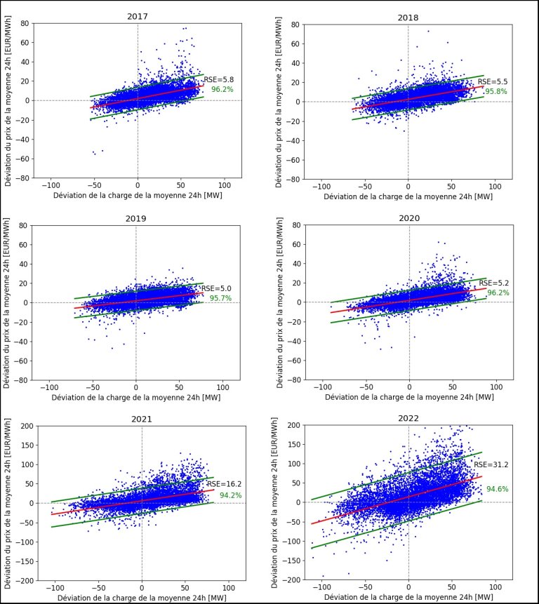 Les années 2017-2022 ont été analysées, et la corrélation en 2019 montre une image typique pour toutes les années précédant la crise énergétique. En 2021, l’augmentation des prix de l’électricité est bien visible à partir du milieu de l’année et deux tendances de corrélation peuvent être bien identifiées pour les deux parties de l’année. En 2022 (non représentée), la corrélation annuelle n’est plus guère visible en raison de la très grande volatilité du prix de l’électricité.