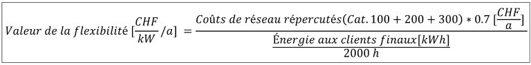 À partir de ce raisonnement, on en déduit aussi l’unité de valeur de la flexibilité: il s’agit uniquement des coûts par puissance fournie (CHF/kW); toutes les grandeurs qui illustrent le recours à la flexibilité, telles que la durée ou la fréquence d’un décalage de charge, ne sont pas pertinentes, car la valeur est calculée pour l’extension conventionnelle du réseau.