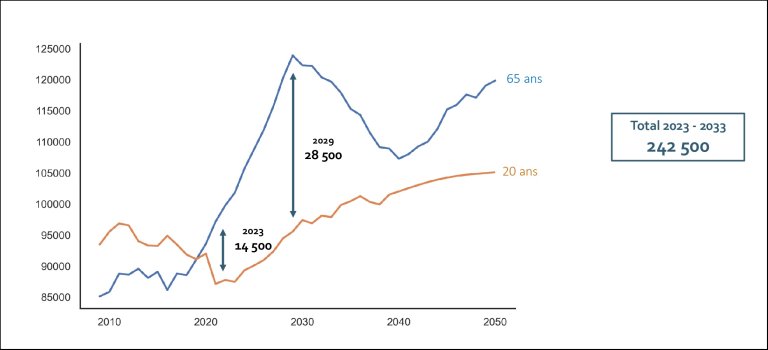 Cette lacune est bien visible dans ce qu’on appelle, à la figure ci-dessus, l’écart sur le marché du travail. Cet écart montre le nombre de personnes d’exactement 65 ans et d’exactement 20 ans en Suisse au fil du temps. Il s’agit d’une approximation du nombre de personnes qui quittent le marché du travail en raison de leur âge et de celles qui entrent sur le marché du travail. Par le passé, la différence entre ces chiffres était toujours positive: il y avait davantage d’entrées sur le marché du travail que de départs. Depuis 2019, cependant, ce n’est plus le cas: il y a depuis lors, en Suisse, davantage de départs du marché du travail en raison de l’âge que d’entrées.