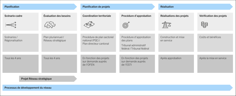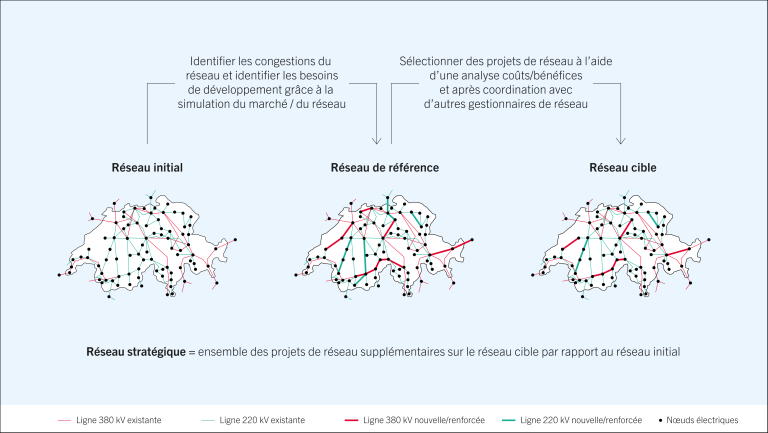Au terme de la régionalisation, Swissgrid disposera de toutes les informations nécessaires pour constituer le Réseau stratégique 2040. Ce processus de planification du réseau a lieu en trois étapes: